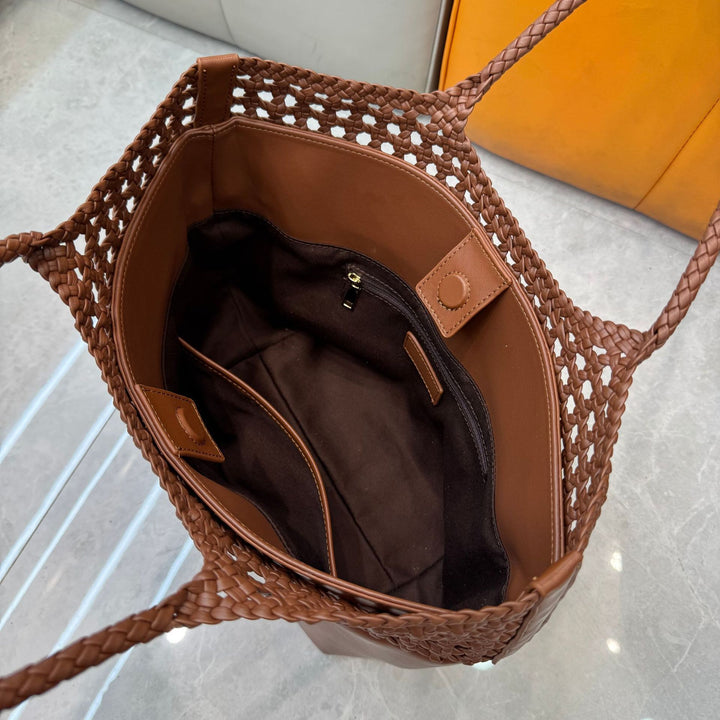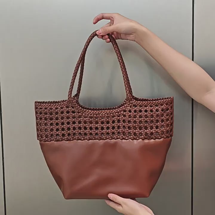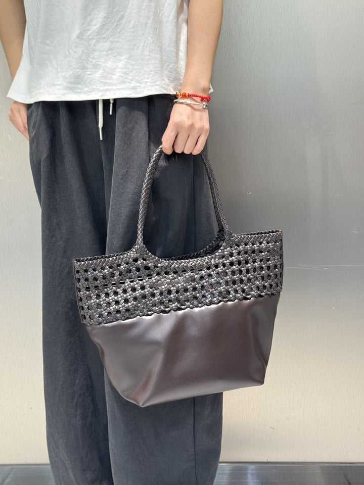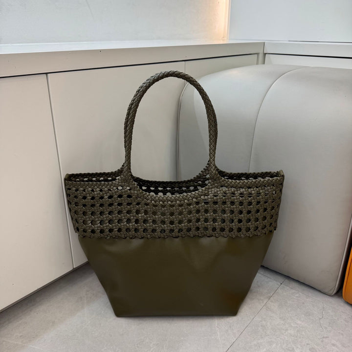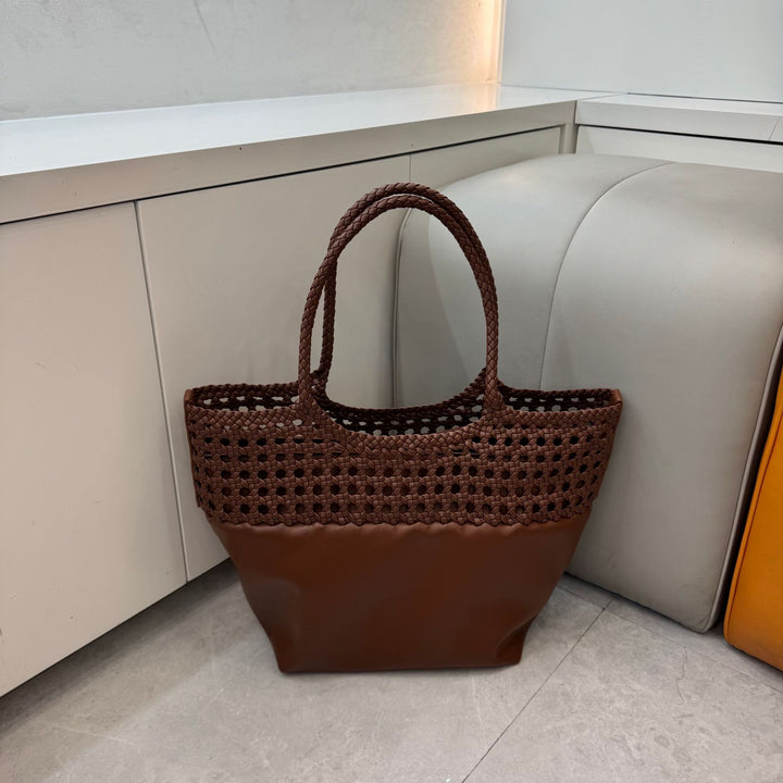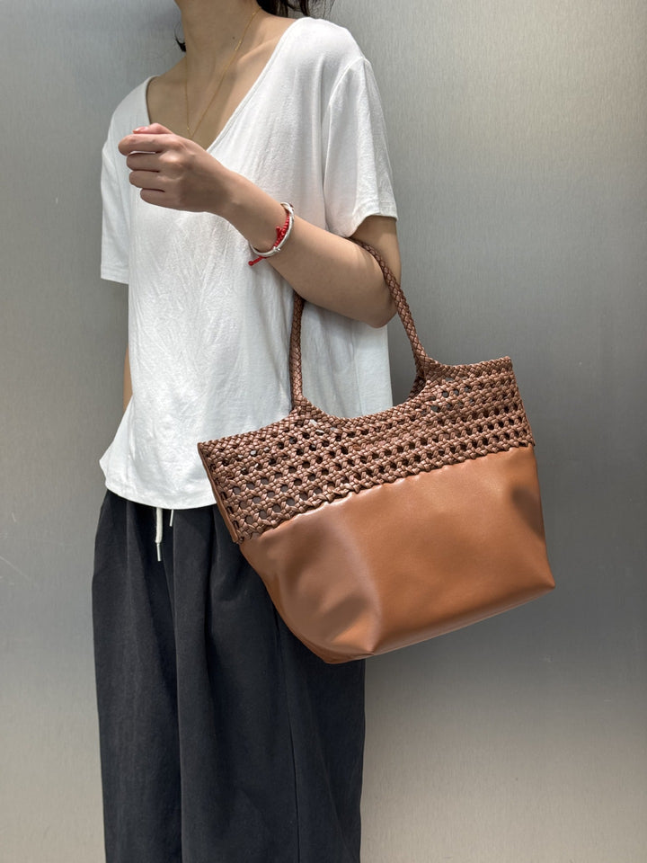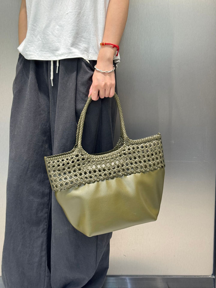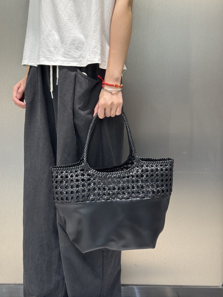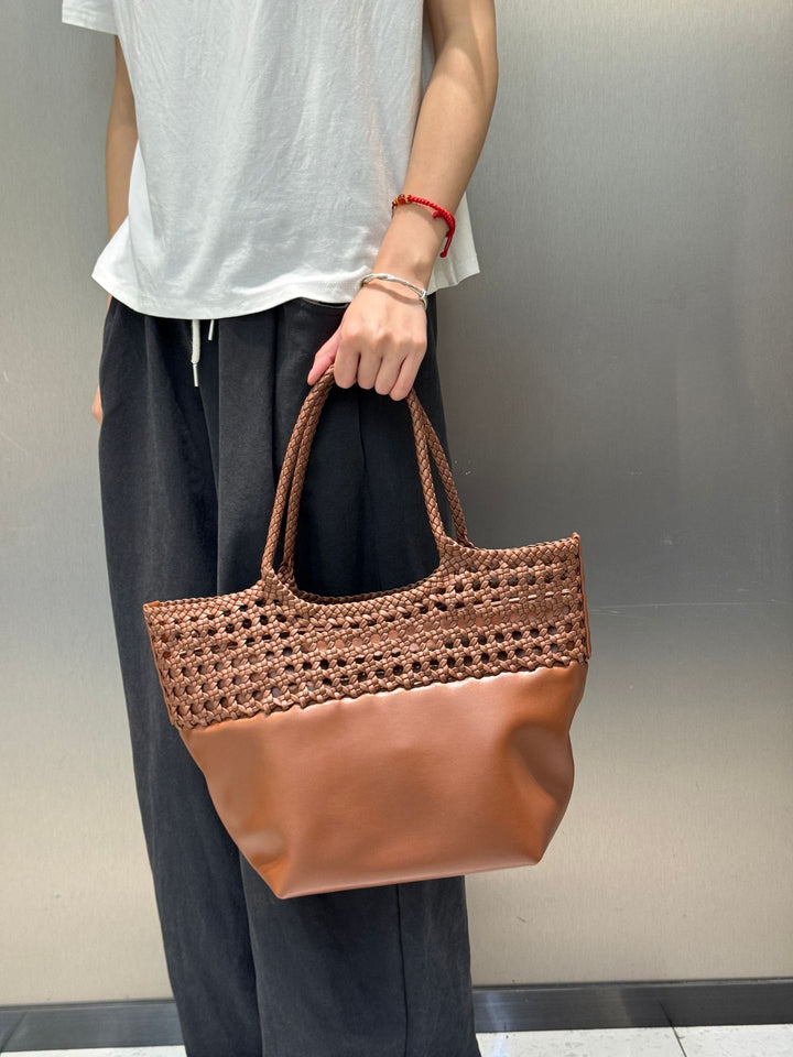 This fashion-forward tote bag features an exquisite woven leather body with delicate cut-out details, creating a modern and breathable structure.Crafted from genuine leather, it offers a spacious interior perfect for daily essentials.The versatile design allows you to carry it effortlessly as a shoulder bag or tucked under your arm, embodying the chic "basket bag" trend.