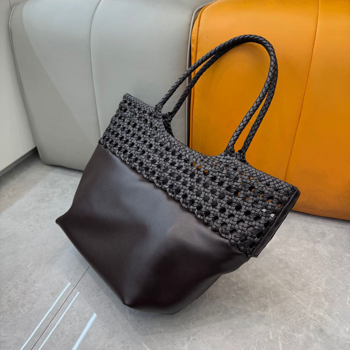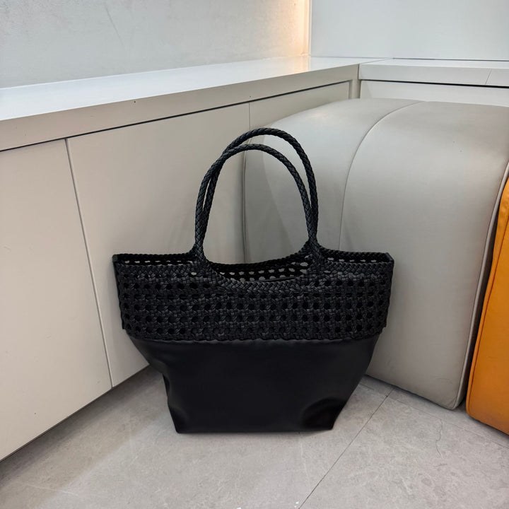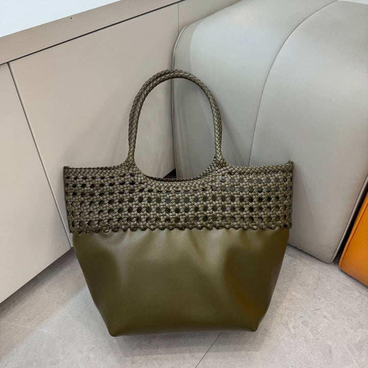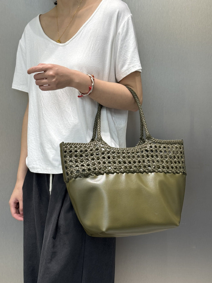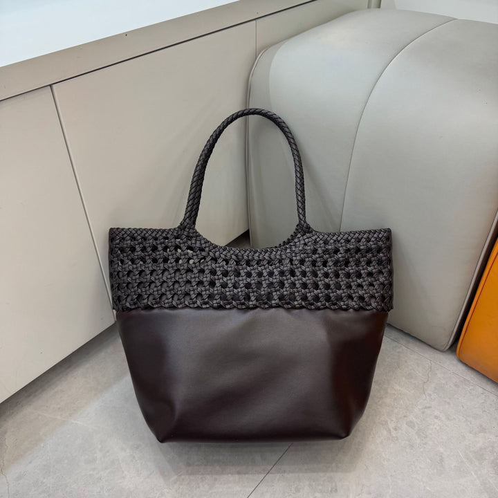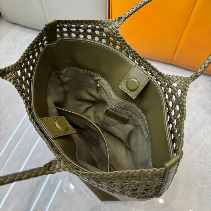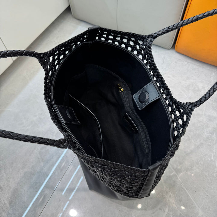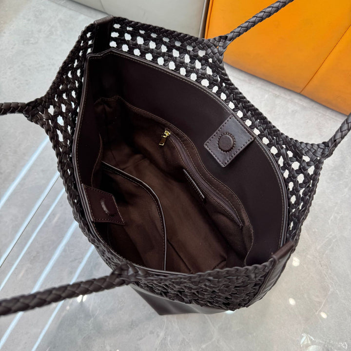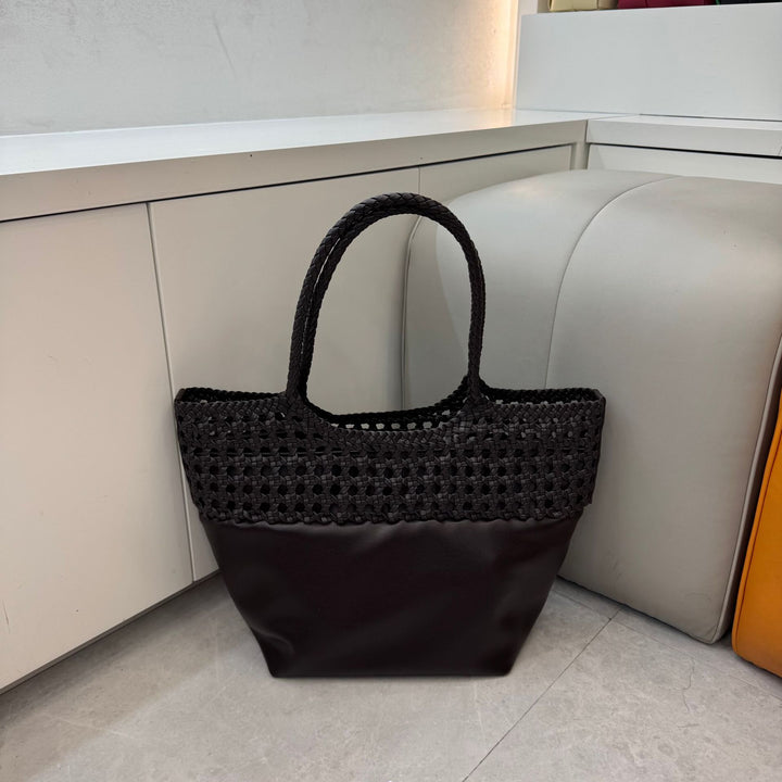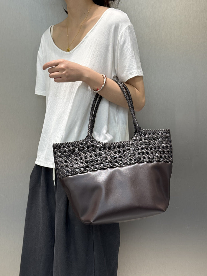 This fashion-forward tote bag features an exquisite woven leather body with delicate cut-out details, creating a modern and breathable structure.Crafted from genuine leather, it offers a spacious interior perfect for daily essentials.The versatile design allows you to carry it effortlessly as a shoulder bag or tucked under your arm, embodying the chic "basket bag" trend.