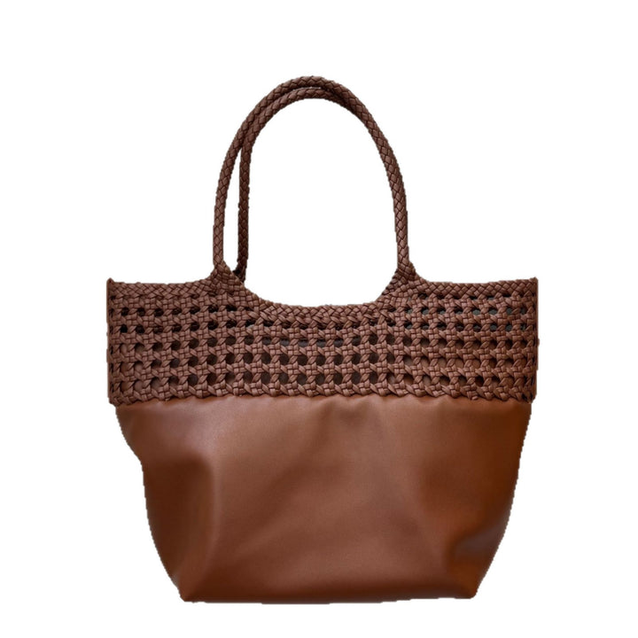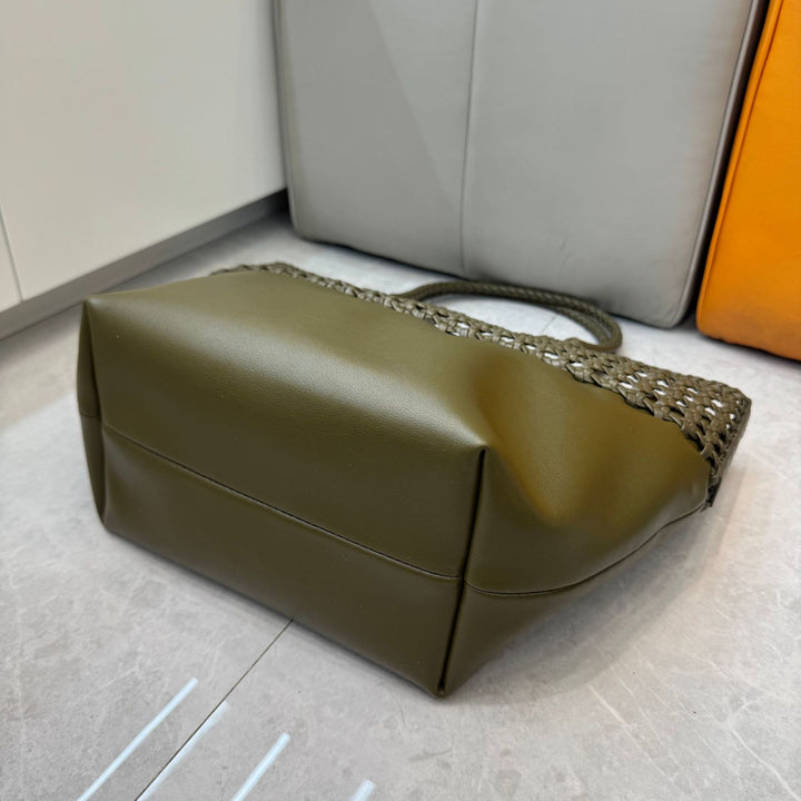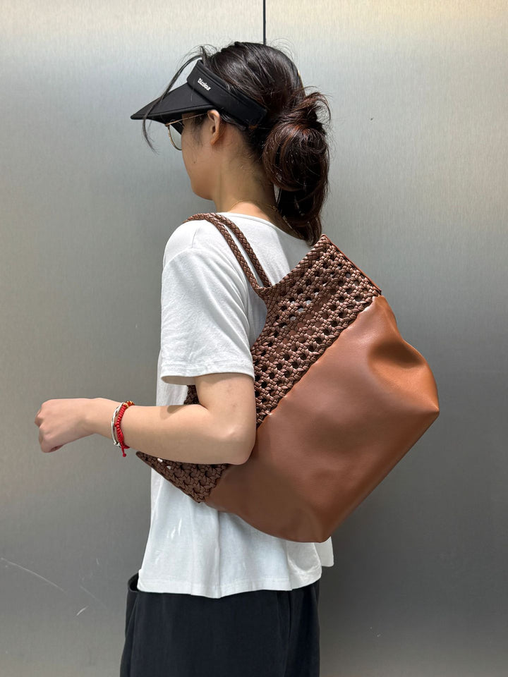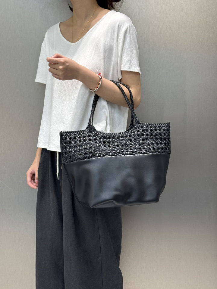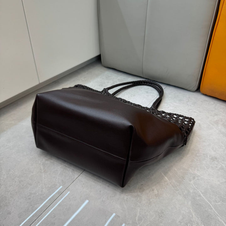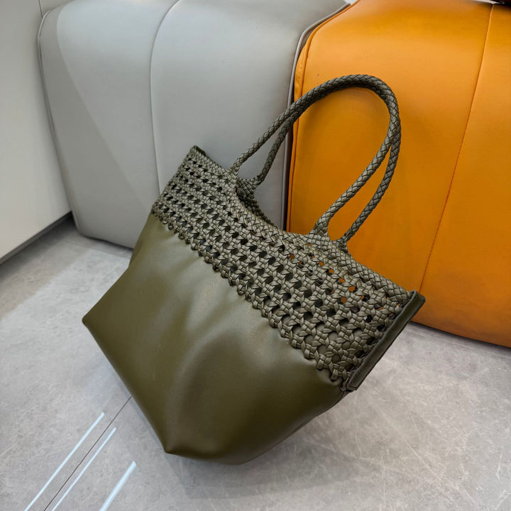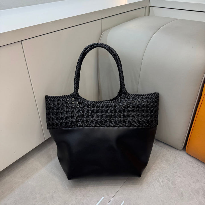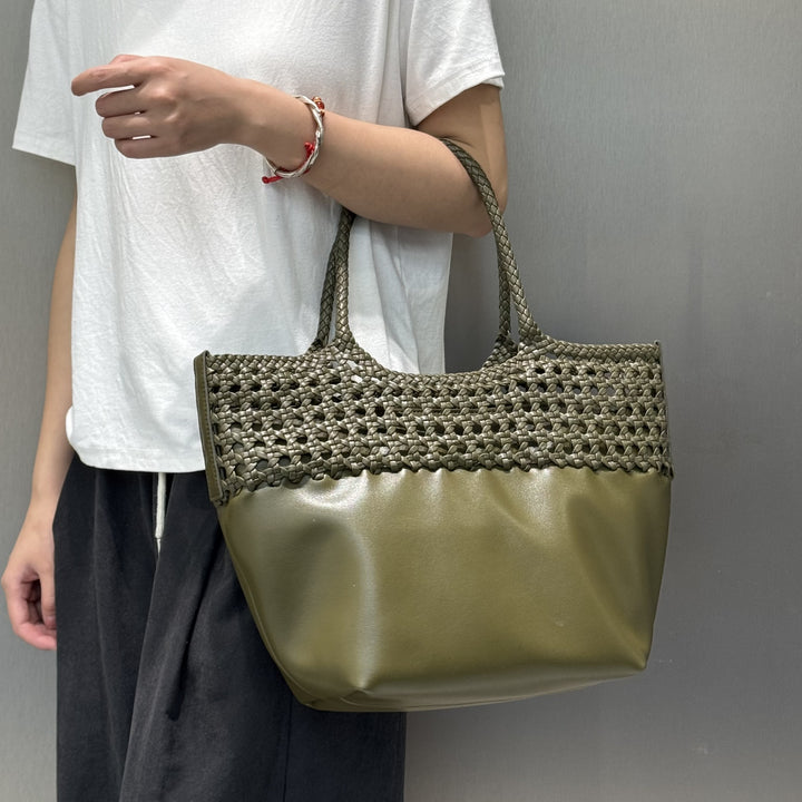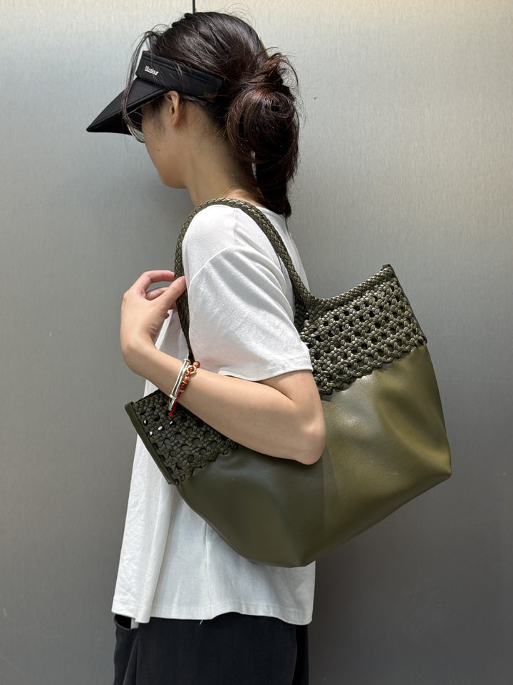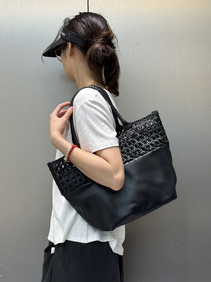 This fashion-forward tote bag features an exquisite woven leather body with delicate cut-out details, creating a modern and breathable structure.Crafted from genuine leather, it offers a spacious interior perfect for daily essentials.The versatile design allows you to carry it effortlessly as a shoulder bag or tucked under your arm, embodying the chic "basket bag" trend.