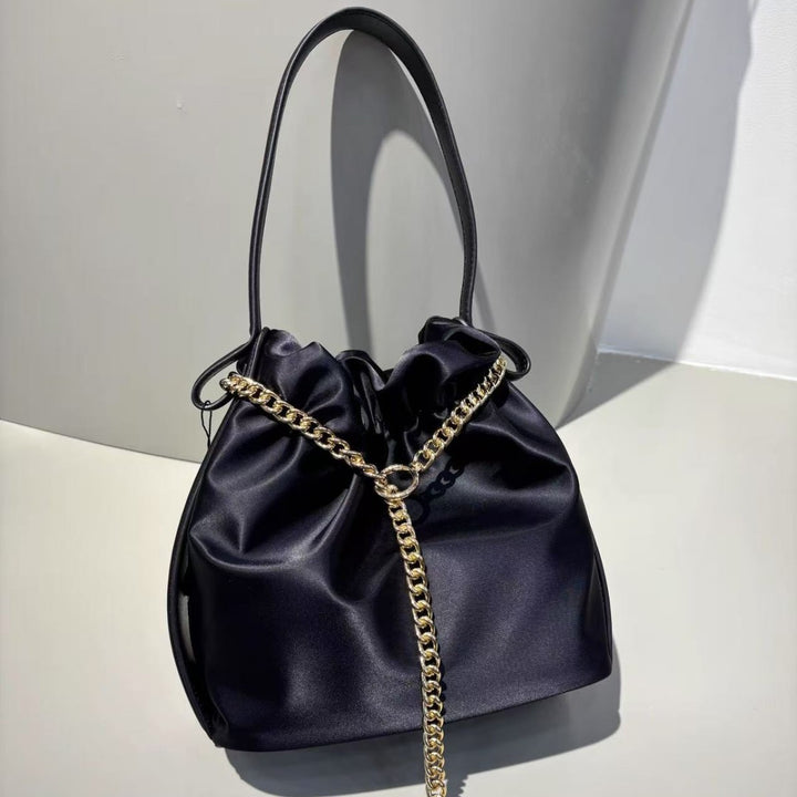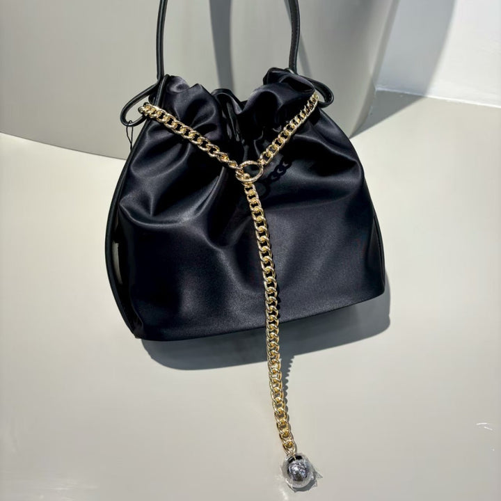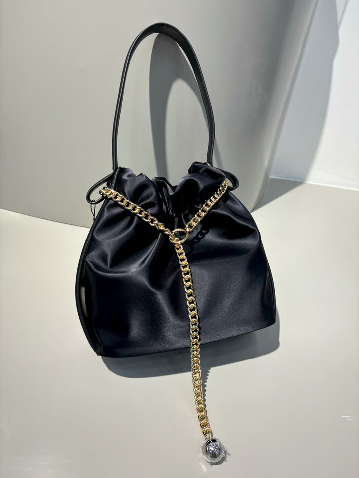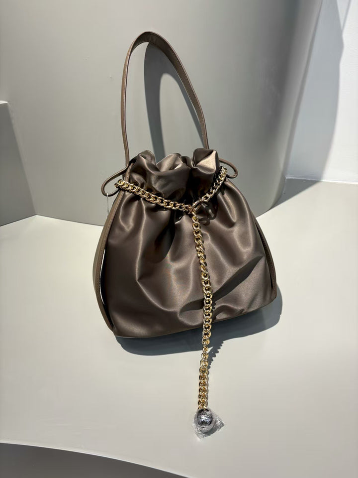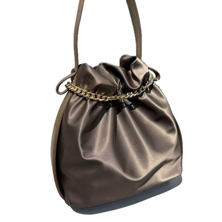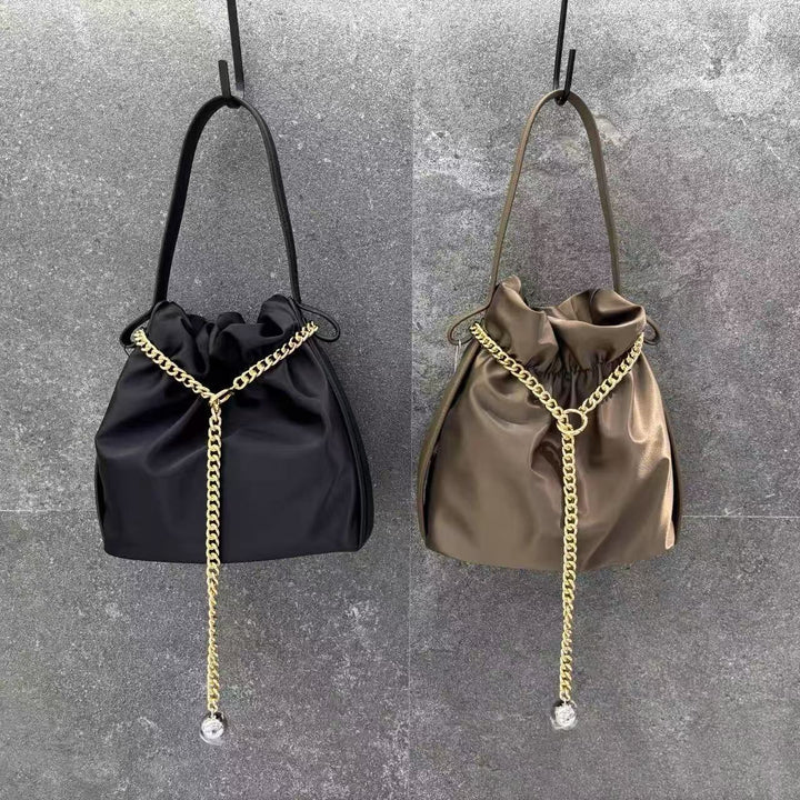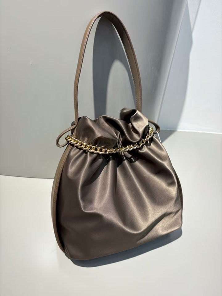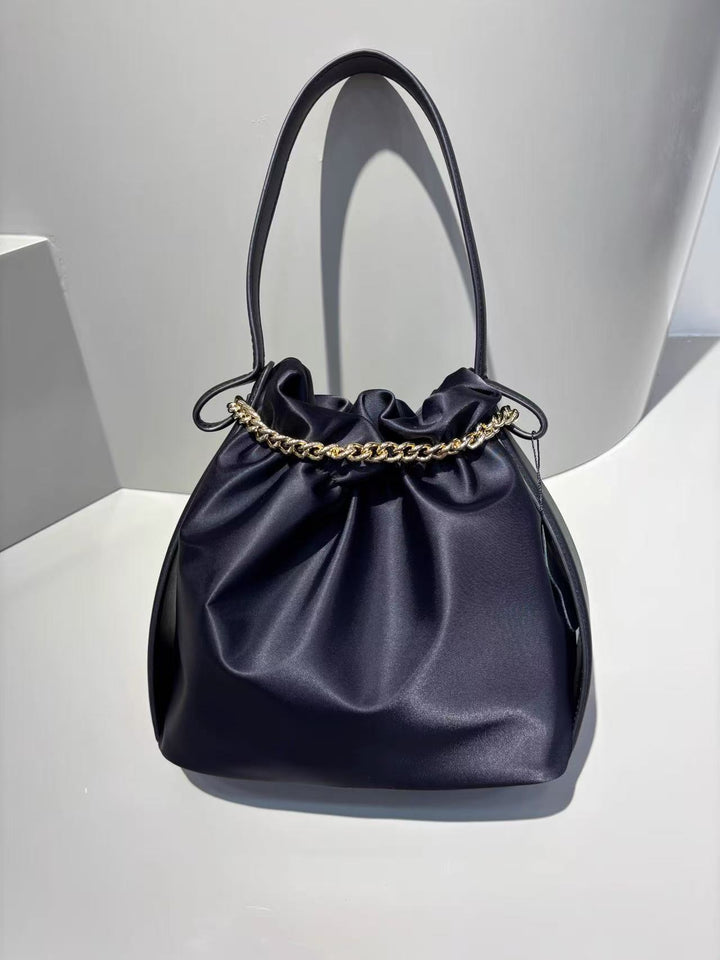 Crafted with waterproof silk-look fabric and genuine leather trim, this minimalist tote combines elegance with functionality. Measuring 23x22x11cm, it offers compact yet practical storage. The adjustable leather chain strap allows versatile wearing - crossbody or shoulder carry. Perfect for daily essentials, it transitions effortlessly from day to night.
