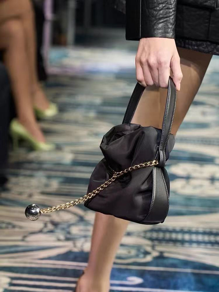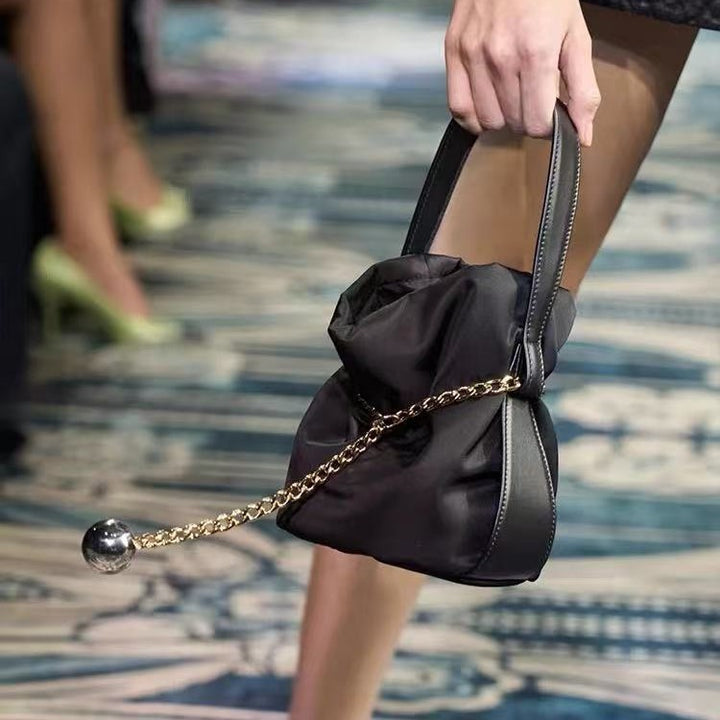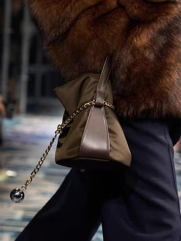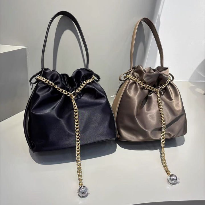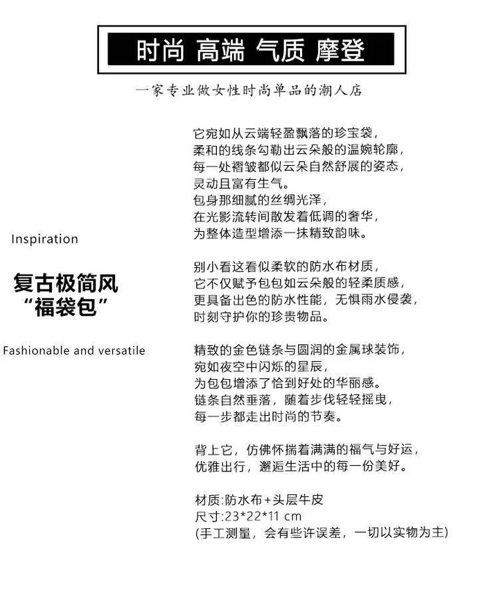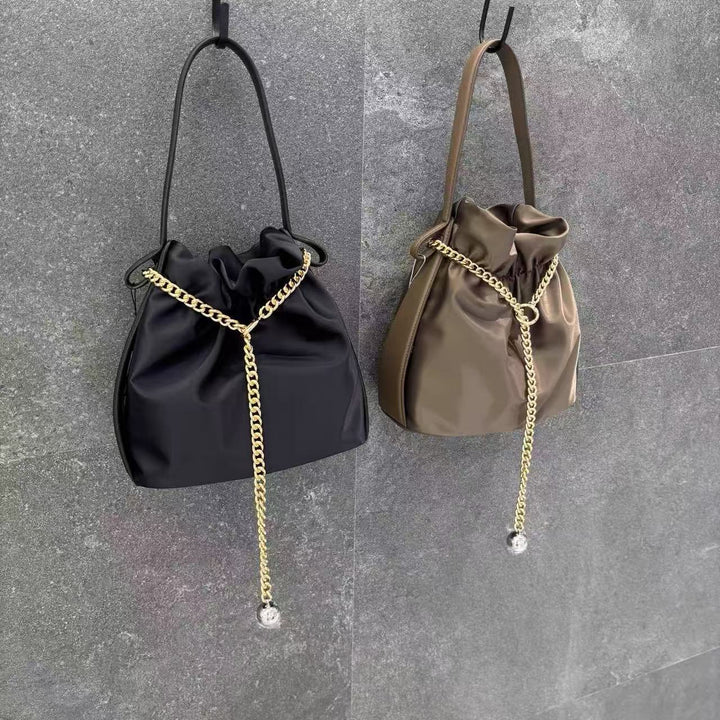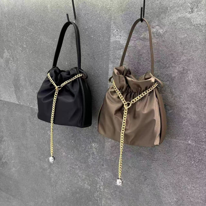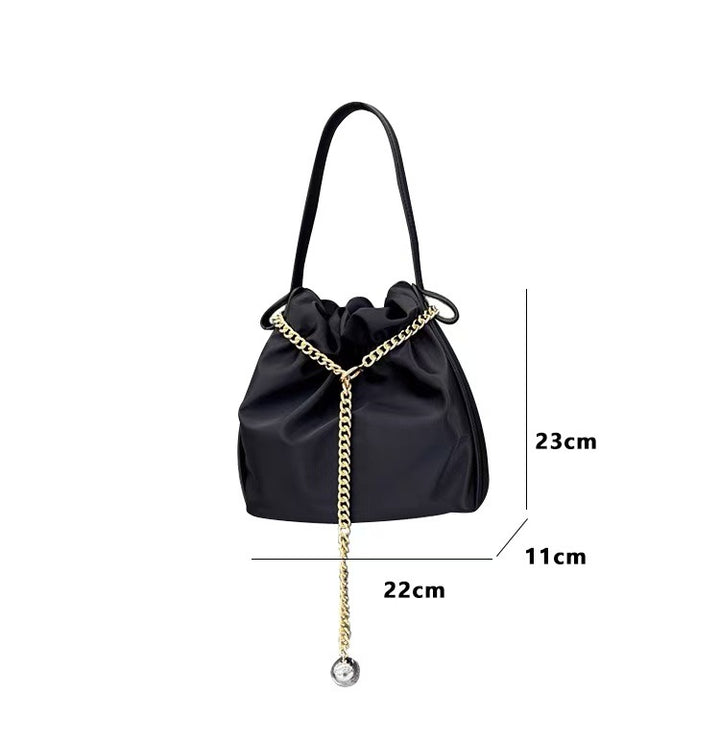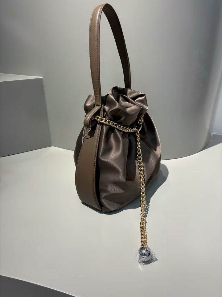 Crafted with waterproof silk-look fabric and genuine leather trim, this minimalist tote combines elegance with functionality. Measuring 23x22x11cm, it offers compact yet practical storage. The adjustable leather chain strap allows versatile wearing - crossbody or shoulder carry. Perfect for daily essentials, it transitions effortlessly from day to night.